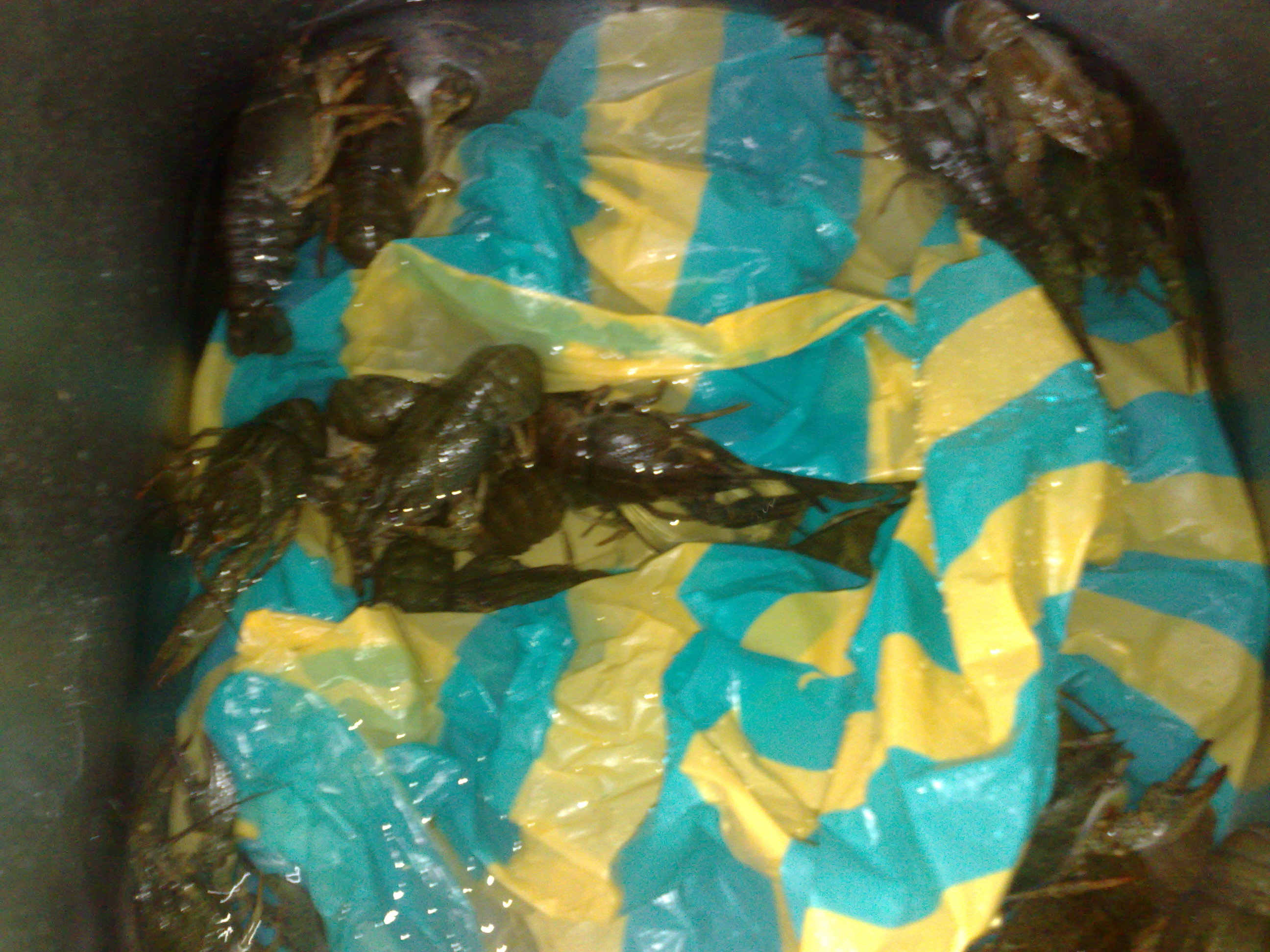 … Aw, what the hell. Here are the crayfish with a suspiciously Ukrainian-themed plastic bag: